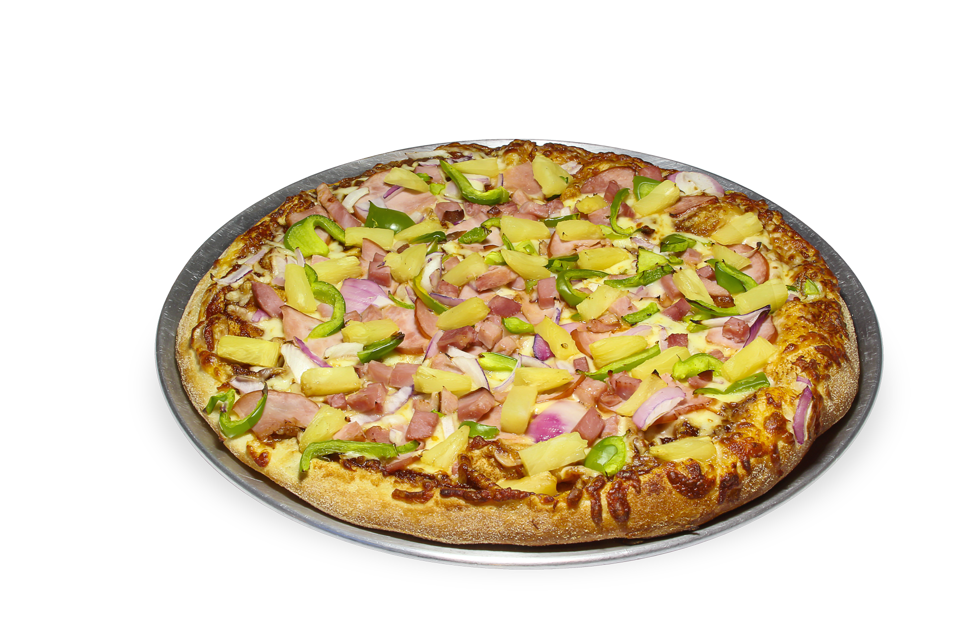 Bringing the islands to you! The Luau features barbecue sauce on hand-tossed crust with Canadian bacon, ham, red onions, green peppers and pineapple, topped with our house-blend cheese. It’s a Maui of a wowie!