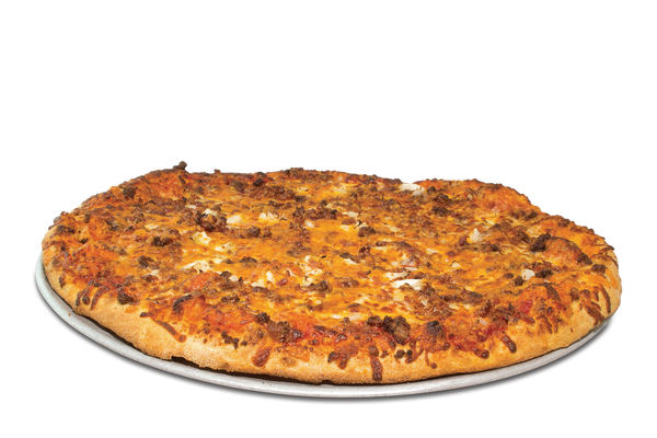 Classic Italian sauce, topped with fresh ground beef, bacon, yellow onions, and our house blend & cheddar cheeses.
