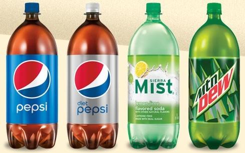 Choose from: Pepsi, Diet Pepsi, Mountain Dew, Diet Mountain Dew, Wild Cherry Pepsi, Starry, Diet Starry, Mug Root Beer, Orange Crush, Grape Crush, Ginger Ale.