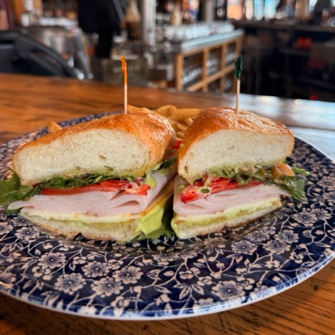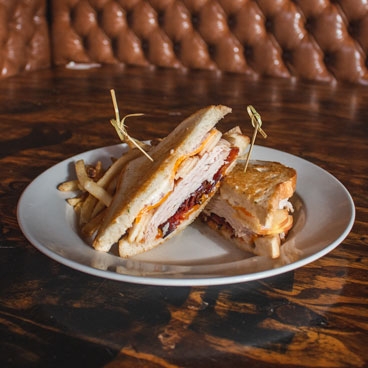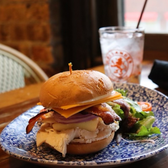 Shaved all-natural turkey, bacon, apples, red onions, cheddar cheese, garlic aioli, Thai chili sauce, toasted sourdough