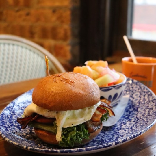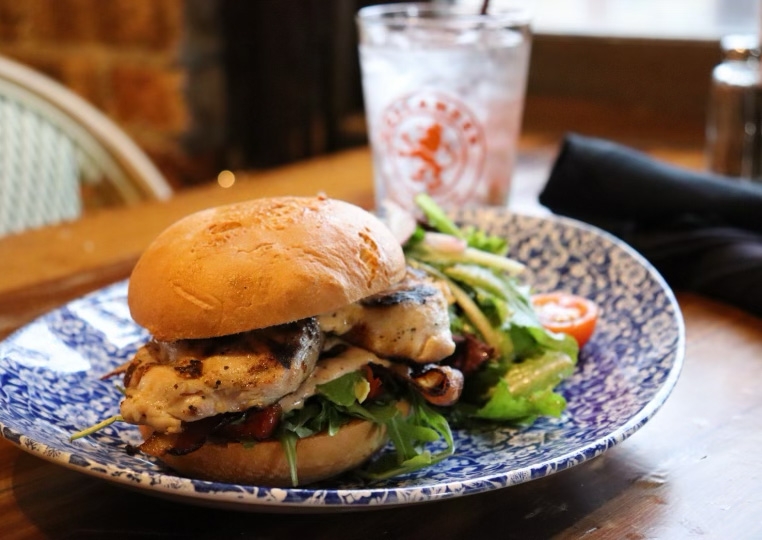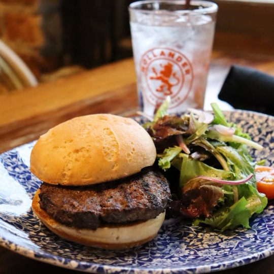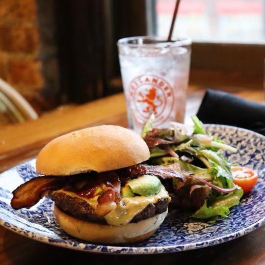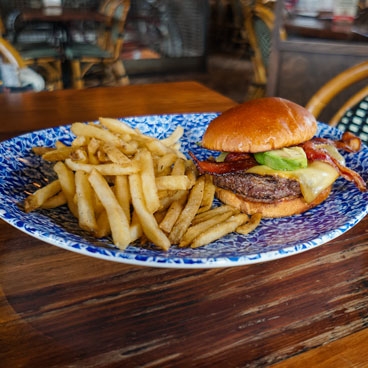 Smoked Gouda, bacon, avocado, jalapeño barbeque, Udi’s gluten free bun, served with a Benelux salad or fruit.