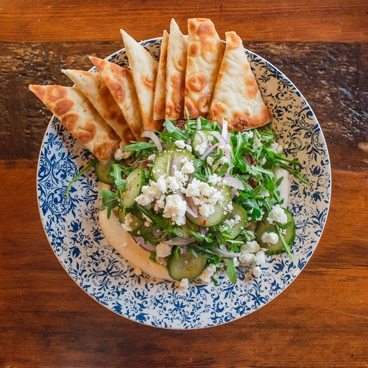 Cauliflower tabbouleh, herb falafel, garlic yogurt, roasted tomato, cucumber, red onion & arugula salad, feta, grilled pita