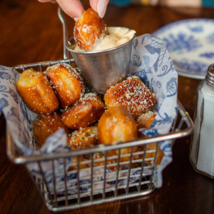 MKE Pretzel Company bites dusted in butter and garlic parmesan with bier cheese aioli