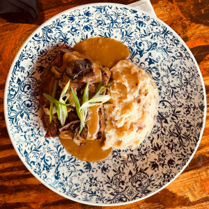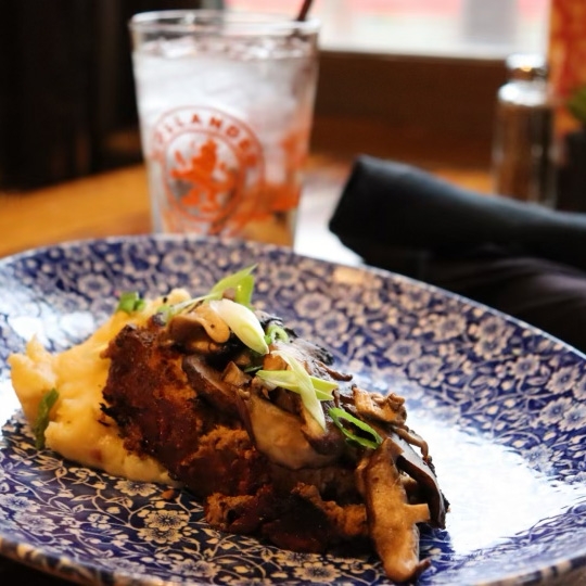 House-blend of ground beef, pork, and spices with mushroom, gravy, and bacon-cheddar mashers Pairs well with Tandem Dubbel