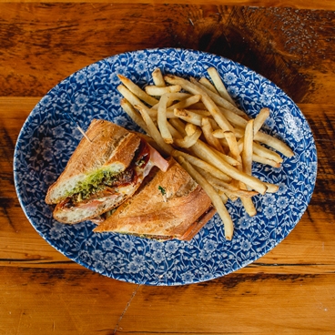 Roasted Roma and fresh sliced tomatoes, garlic aioli, broiled brie cheese, basil pesto, toasted baguette