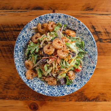 Mixed greens & Belgian endive blend, cilantro yogurt dressing, blackened shrimp, avocado, red onion, tomatoes, asparagus, carrots, potato crispies