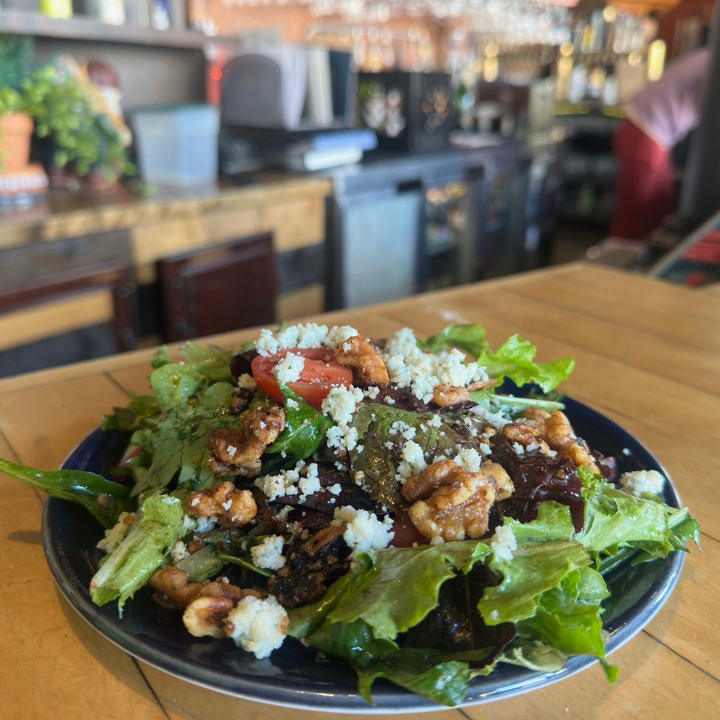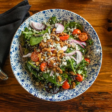 Organic mixed greens, tomatoes, candied walnuts, red onions, bleu cheese, balsamic vinaigrette