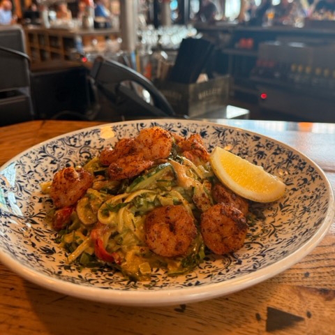 Linguine pasta with herb cream sauce, zucchini, mushrooms, bell peppers, tomatoes, asparagus, fresh parmesan, blackened shrimp
