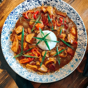 Andouille sausage, shrimp, chicken, Roma tomatoes, onion, sweet peppers, jasmine rice, spicy cajun sauce Pairs well with Hollander IPA