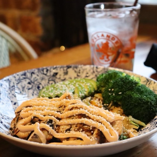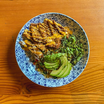 Grilled chicken, avocado, broccoli, quinoa garden medley, sesame seeds, sriracha mayo