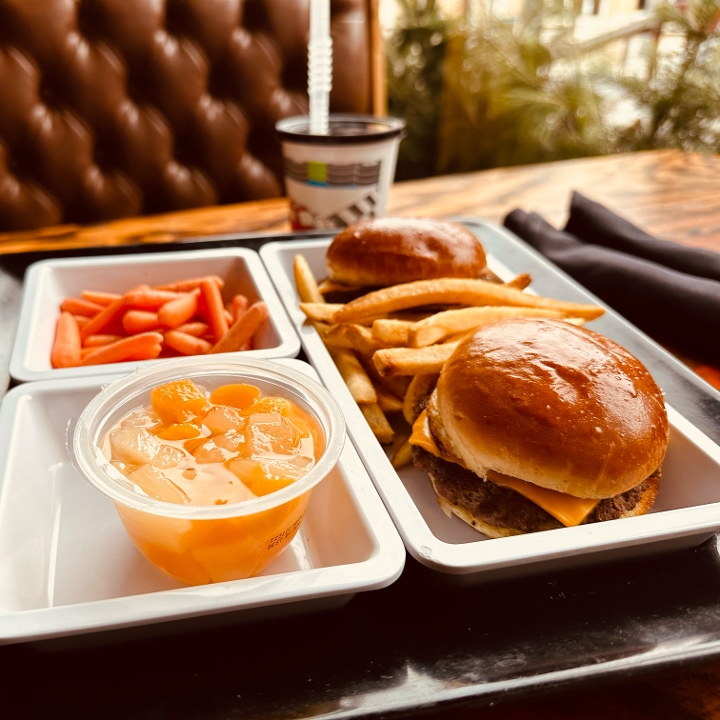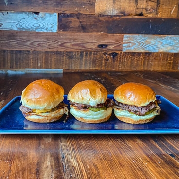 Three mini smash burgers topped with caramelized onions, cheddar cheese, pickles, bier cheese aioli
