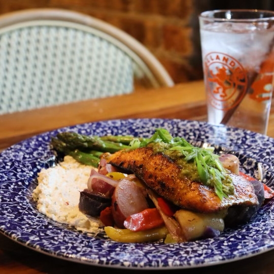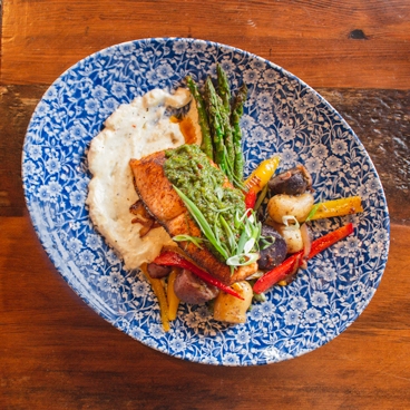 Six-spice rubbed Atlantic salmon, garlic lemon fingerlings, sweet red peppers, red onion, asparagus, whipped feta, cilantro zhoug