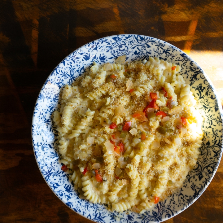 Five-cheese sauce, pickled peppers, rotini pasta, toasted bread crumbs Pairs well with Bofferding