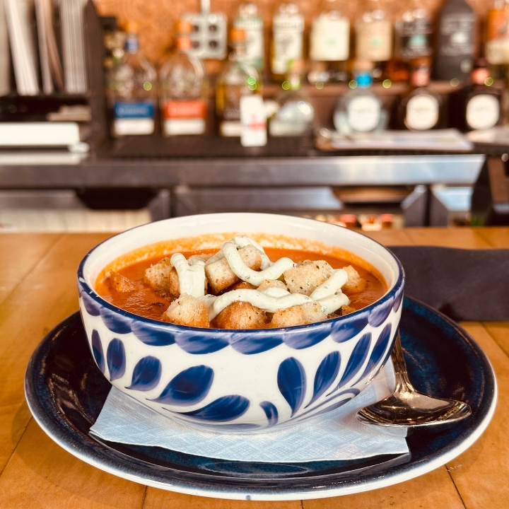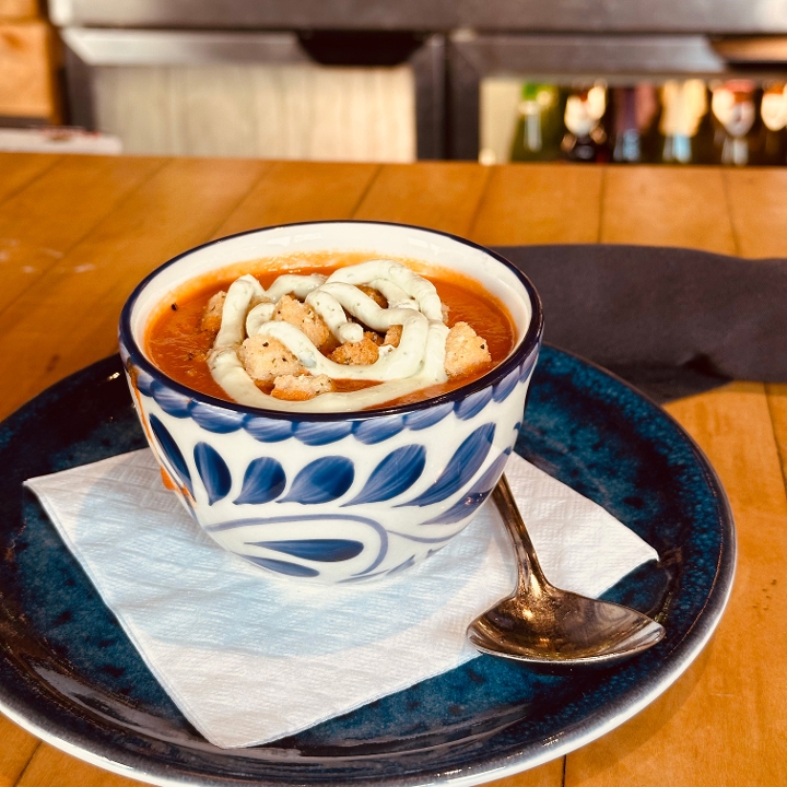 Roasted tomatoes, onion, garlic, basil crème fraîche, parmesan croutons
