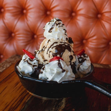 Fresh baked chocolate brownie, salted caramel ice cream, hazelnut chocolate sauce, whipped cream, strawberries