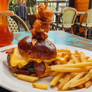 Pickles, bacon, Wisconsin-aged cheddar cheese, beer cheese aioli, cheese curds, pretzel bun
