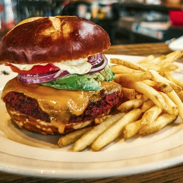 Roasted beet & quinoa smash-patties, cheddar cheese, tomato, avocado, red onions, basil aioli, pretzel bun