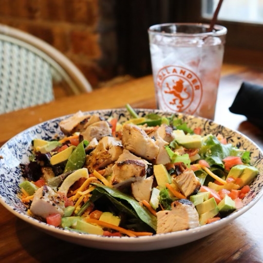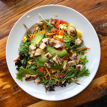 Organic mixed greens, chopped chicken, bacon, avocado, hard-boiled egg, cheddar, carrots, tomatoes, charred poblano buttermilk dressing