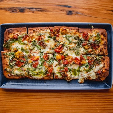 Marinated fresh mozzarella, oven-roasted tomatoes, herb goat cheese spread, arugula, pesto drizzle