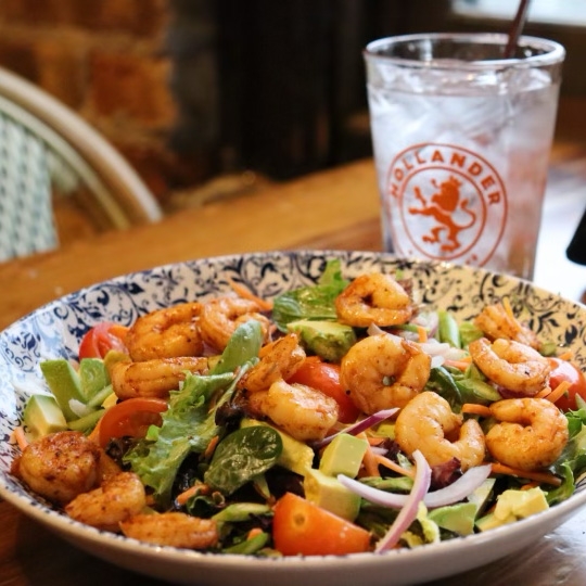 Mixed greens & Belgian endive blend, blackened shrimp, avocado, red onion, tomatoes, asparagus, carrots, cilantro yogurt dressing