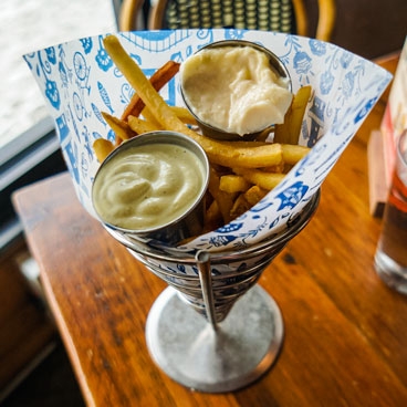 Classic Dutch snack of bite-sized haddock chunks, tartar sauce, lemon