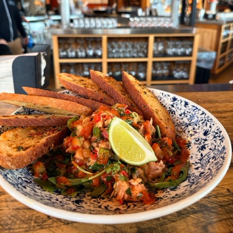 Chipotle salmon salad with cucumber-melon relish, arugula, smoked paprika sauce, toasted crostini, lime