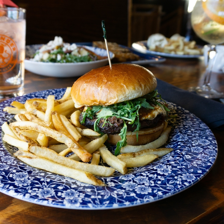 Guinness braised corned beef brisket topped with sauerkraut and melted Swiss cheese. Served on toasted rye bread with pickle harissa, and a side of frites