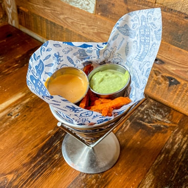 Roasted cauliflower, mushrooms, shredded beets, goat & Edam cheeses, basil pesto, frites
