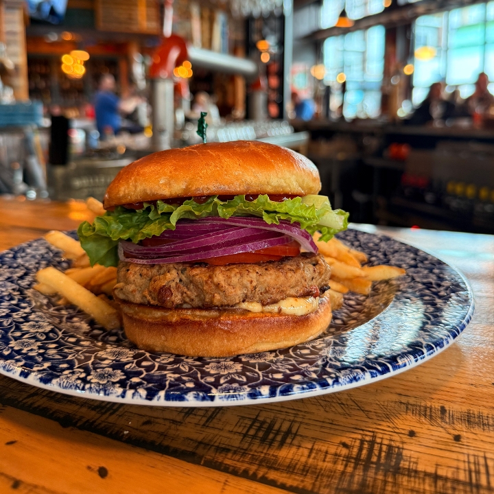 House-blend turkey burger, curry ketchup, garlic aioli, green leaf lettuce, tomato, red onion, brioche bun