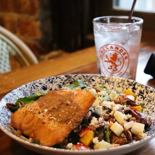 Organic spring mix & baby kale blend, Atlantic salmon, butternut hash, honey crisp apples, roasted pecans, feta cheese, red onion, pecan vinaigrette