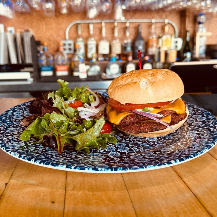 Roasted beet & quinoa patties, cheddar cheese, tomato, avocado, red onions, basil aioli,